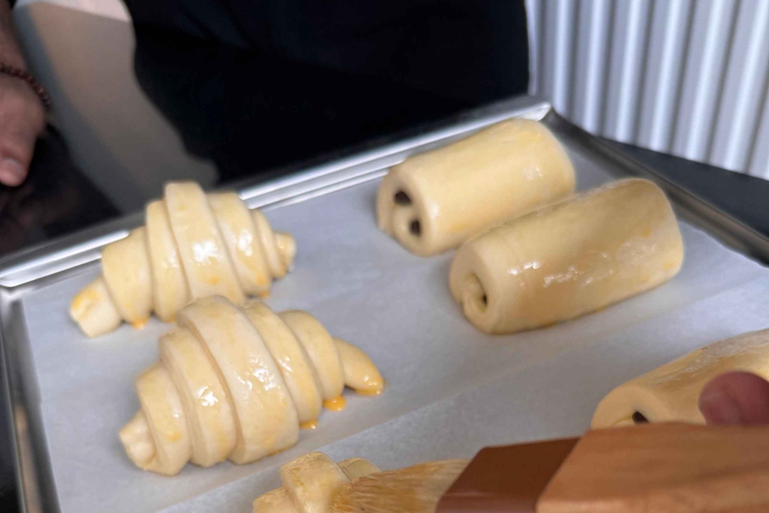 Bienvenue dans le monde enchanteur de la cuisson des croissants. Entrez dans la cuisine accueillante de la boulangerie, où l'air est rempli de l'arôme alléchant des pâtisseries fraîchement cuites, préparant le terrain pour un voyage culinaire inoubliable. Votre guide pour cette délicieuse aventure n'est autre que notre chef maison, qui est un maestro dans l'art de la pâtisserie française. Rassemblez-vous autour du poste de travail et le chef vous guidera de manière experte à travers chaque étape du processus, de la préparation de la pâte délicate à la maîtrise des techniques de pliage précises qui permettent d'obtenir les couches feuilletées caractéristiques. Grâce à des conseils attentifs, vous sentirez vos compétences évoluer au fil des pétrissages et des pliages, et prendrez confiance en votre capacité à créer des croissants dignes d'une pâtisserie parisienne. Pendant que la pâte repose et lève, vous découvrirez les secrets de la fabrication d'un croissant parfait. De l'importance de la qualité du beurre aux nuances de la fermentation, vous comprendrez mieux le savoir-faire artisanal nécessaire pour obtenir une texture et une saveur optimales. Laissez libre cours à vos questions tout en vous imprégnant de la richesse des connaissances du chef et en absorbant chaque détail. La pâte étant prête, il est temps de façonner vos créations. Sous l'œil attentif du chef, coupez, roulez et façonnez soigneusement la pâte en croissants classiques, en veillant à ce que chacun d'eux soit un chef-d'œuvre à part entière. À chaque tour de main, vous ressentez un sentiment d'accomplissement, sachant que vous êtes sur la voie de la perfection du croissant. Au milieu des sourires de satisfaction que vous partagez, vous entendez les dernières paroles de sagesse qui vous permettront de repartir non seulement avec un ventre plein de croissants, mais aussi avec les connaissances et la confiance nécessaires pour les recréer chez vous. En faisant vos adieux aux autres participants et au chef, vous emporterez avec vous non seulement une recette, mais aussi une nouvelle passion pour l'art de la fabrication des croissants. Améliorez votre expérience avec notre option exclusive de cours de cuisson de croissants bicolores, certains jours. Apprenez l'art d'incorporer des couleurs vives à votre pâte à croissant. Ce cours est idéal pour les boulangers chevronnés ou les passionnés qui cherchent à donner du style à leurs créations.Includes